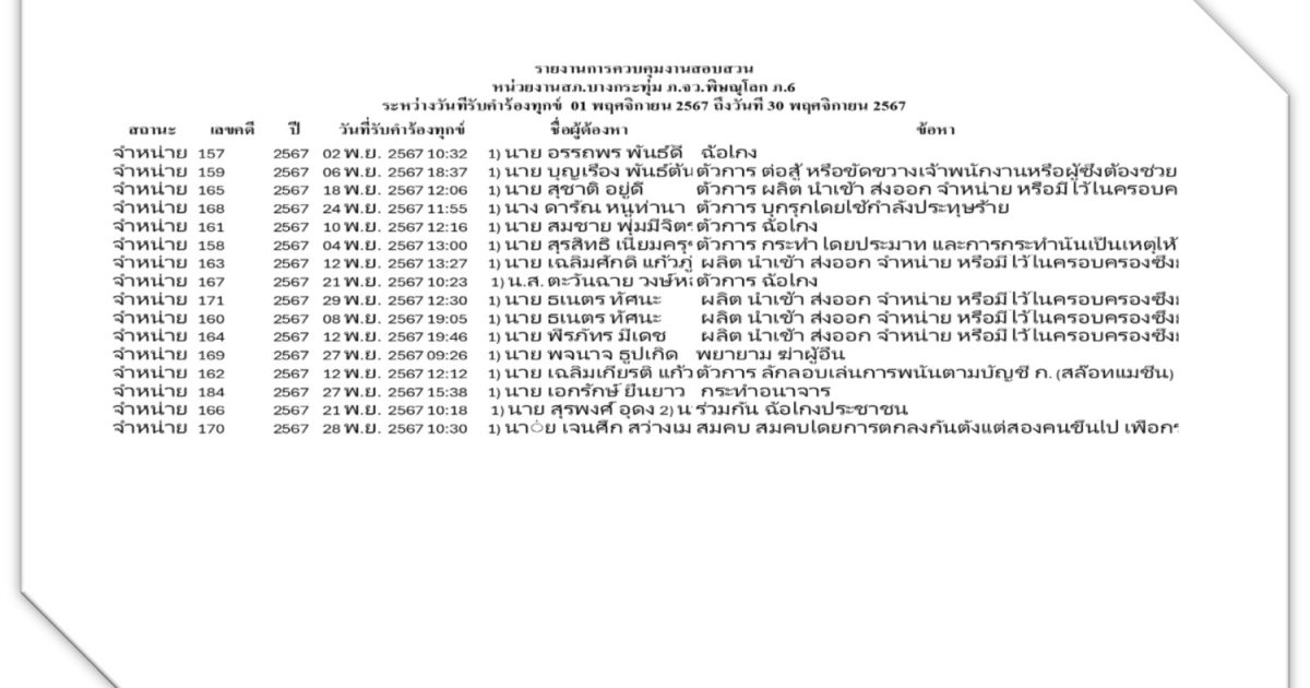 ประชาสัมพันธ์ 1 ธันวาคม 2567 by admin / ข่าวประชาสัมพันธ์,ประชาสัมพันธ์ งาน สอบสวน ช่วงวันที่ 1 พ.ย. 2567 ถึง 30 พ.ย. 2567 พนักงานสอบสวนได้รับสำนวนคดีอาญาไว้ทำการสอบสวน 16 คดี สอบสวนเสร็จสิ้นแล้ว 16 คดี คงเหลือและอยู่ระหว่างการสอบสวน 0 คดี และ พนักงานสอบสวนได้รับสำนวนคดีจารจรไว้ทำการสอบสวน 2 คดี สอบสวนเสร็จสิ้นแล้ว 2 คดี คงเหลือและอยู่ระหว่างการสอบสวน 0 คดี