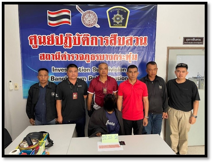 เจ้าหน้าที่ชุดจับกุม นำโดย พ.ต.ท.สมพร การะเกตุ สว.สส.สภ.บางกระทุ่ม พร้อมด้วยชุดสืบสวน ได้ออกระดมกวาดล้างอาชญากรรม ได้จับกุมตัว พร้อมด้วยของกลางยาเสพติดให้โทษประเภท 1 (ยาบ้า) จำนวน 12,899 เม็ด พร้อมอาวุธปืนซองสั้น จำนวน 1 กระบอก กระสุนขนาด 12 จำนวน 8 นัด