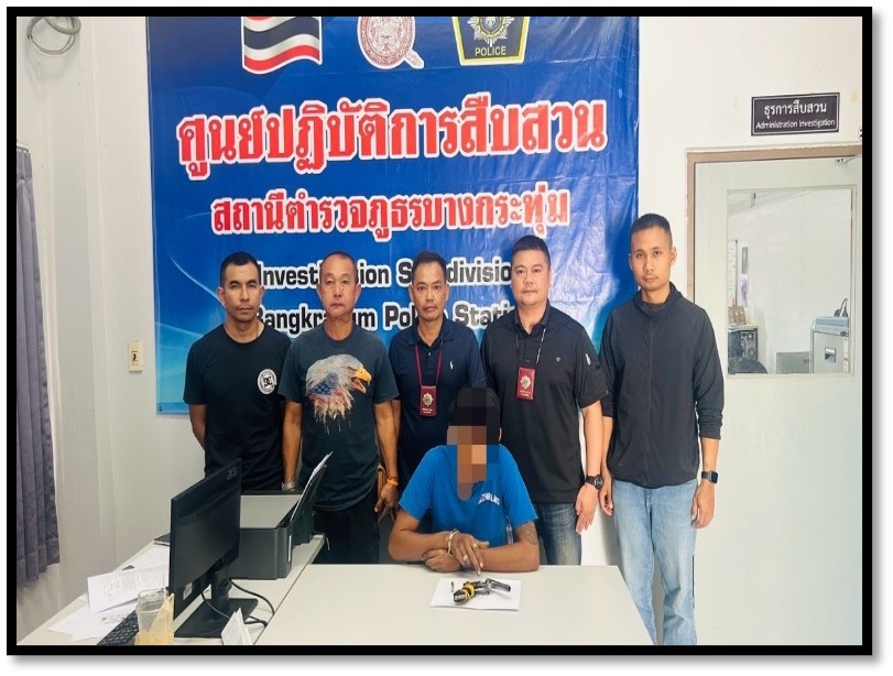 เจ้าหน้าที่ชุดจับกุม นำโดย ร.ต.อ.สุกิจ บุญแต่ง รอง สว.สส.สภ.บางกระทุ่ม พร้อมด้วยชุดสืบสวน ออกระดมกวาดล้างอาชญากรรม ได้จับกุมตัว พร้อมด้วยของอาวุธปืนไทยประดิษฐ์ 1 กระบอก พร้อมเครื่องกระสุนปืนขนาด 9 มม. จำนวน 1 นัด