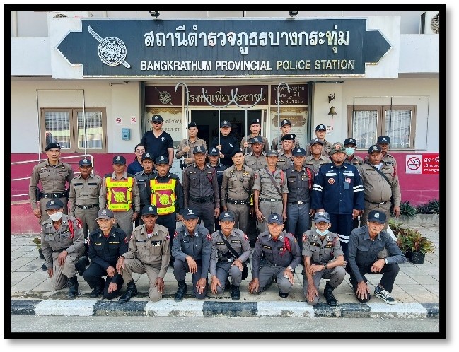 ร้อยเวร 20 พร้อม สายตรวจรถยนต์ นักเรียนนายสิบตำรวจ ว.4 วิทยากรโครงการพัฒนาคุณภาพผู้เรียนอบรมจิตอาสาห่วงใยขับขี่ปลอดภัยป้องกันภัยจากอุบัติเหตุ ณ ห้องสมุดประชาชนอำเภอบางกระทุ่ม