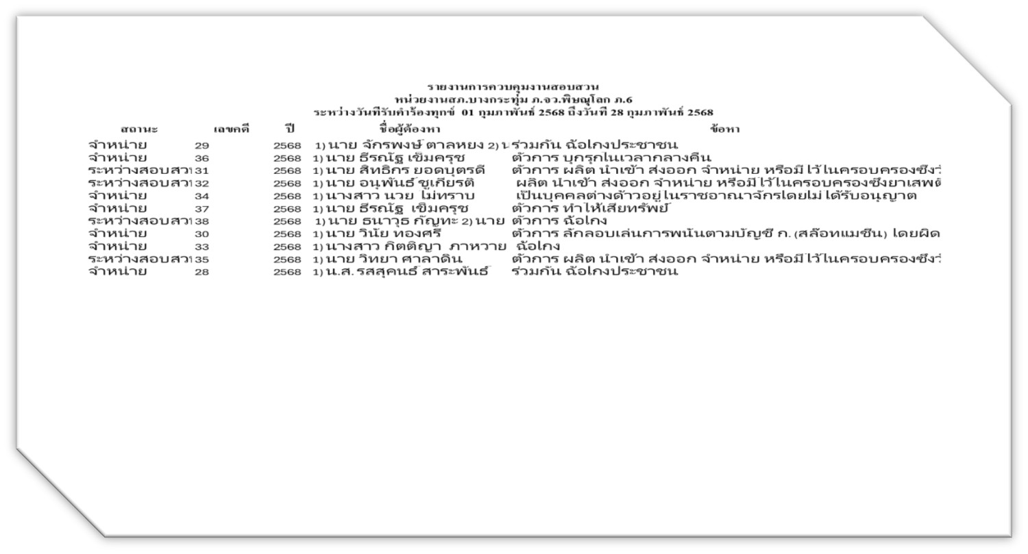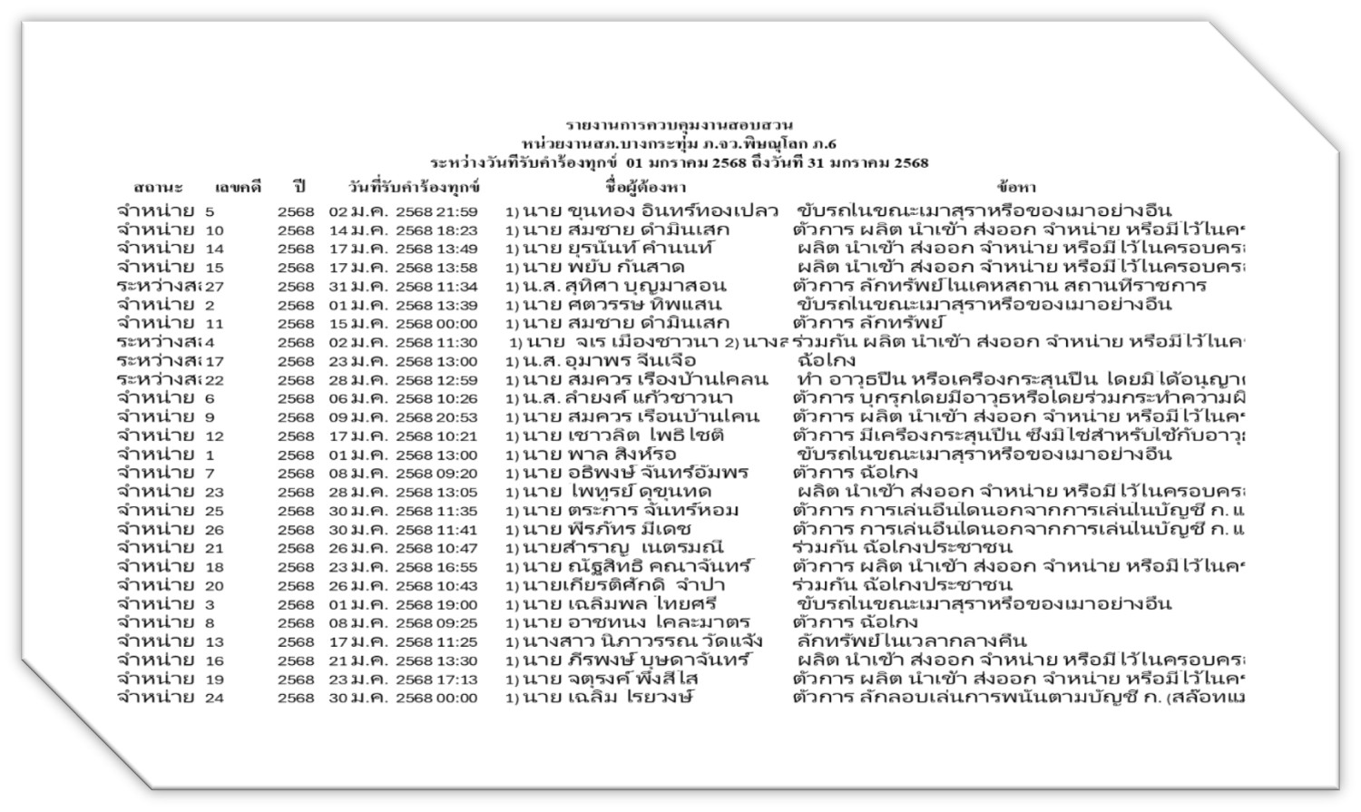 ช่วงวันที่ 1 ม.ค. 2568 ถึง 31 ม.ค. 2568 พนักงานสอบสวนได้รับสำนวนคดีอาญาไว้ทำการสอบสวน 27 คดี สอบสวนเสร็จสิ้นแล้ว 23 คดี