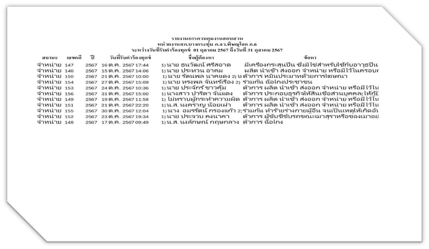 ช่วงวันที่ 1 ต.ค. 2567 ถึง 31 ต.ค. 2567 พนักงานสอบสวนได้รับสำนวนคดีอาญาไว้ทำการสอบสวน 11 คดี สอบสวนเสร็จสิ้นแล้ว 11 คดี