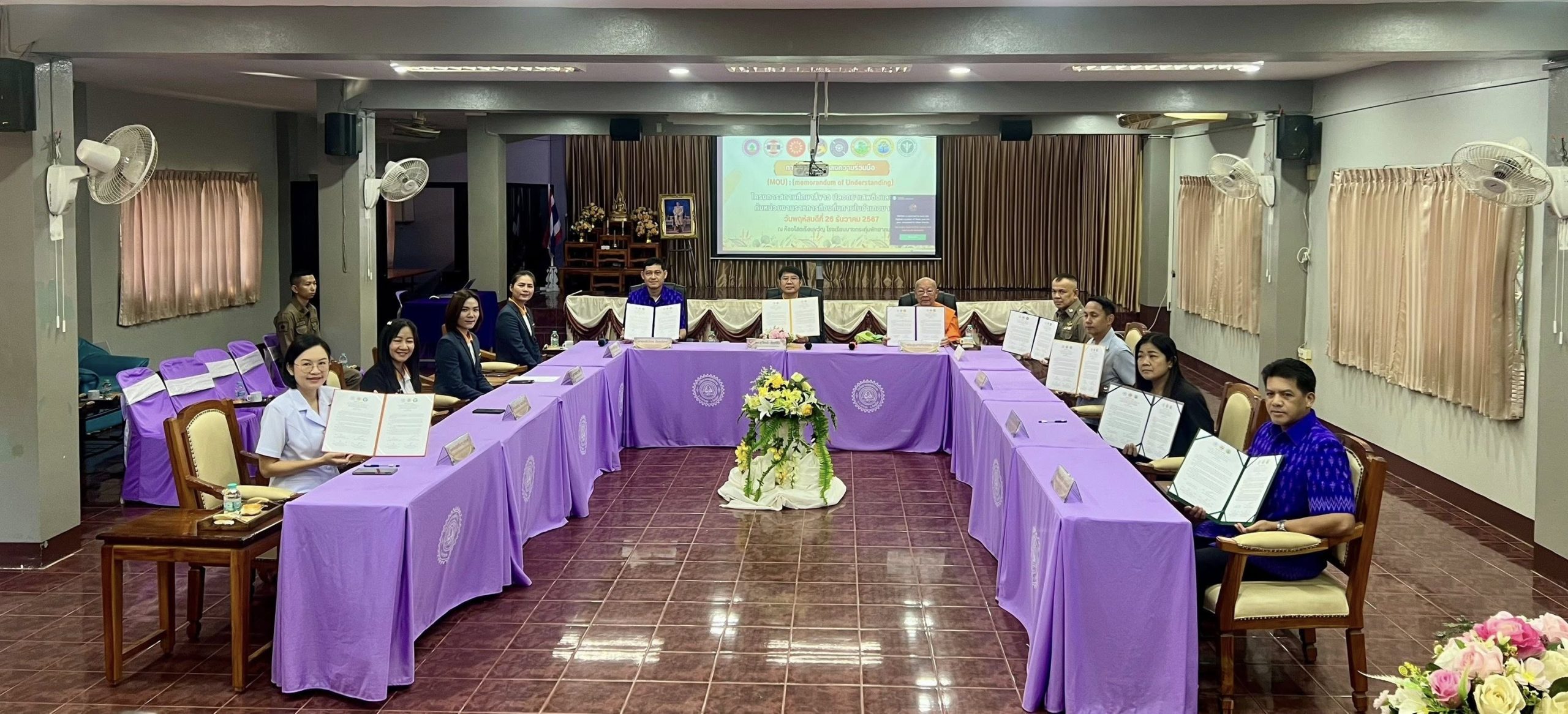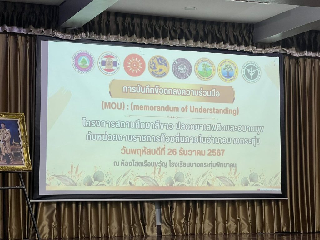 วันที่ 26 ธันวาคม 2567 เวลา 09.30 น. พระครูสุนทรกิตติรัต รองเจ้าคณะจังหวัดพิษณุโลก เจ้าอาวาสวัดห้วยแก้ว นายวรวงศ์ พงศบุตร นายอำเภอบางกระทุ่ม พ.ต.ท.ทวิช ถึงจันทร์ รอง ผกก.ป.สภ.บางกระทุ่ม นายสุวัฒน์ สัตย์ซื่อ ผู้อำนวยการโรงเรียนบางกระทุ่มพิทยาคม (กต.ตร.สภ.ฯ) นายอนุ เสาวกูล หัวหน้าสาธารณสุขอำเภอบางกระทุ่ม (กต.ตร.สภ.ฯ) ร่วมลงนามในการกิจกรรม MOU โครงการสถานศึกษาสีขาวปลอดยาเสพติดและอบายมุขกับหน่วยงานราชการอำเภอบางกระทุ่ม เพื่อเพิ่มประสิทธิภาพในการป้องกันปราบปรามและเฝ้าระวังปัญหายาเสพติด สร้างความปลอดภัยให้กับนักเรียนจากภัยคุกคามรูปแบบใหม่ทุกรูปแบบ ณ ห้องโสตเรือนขวัญ โรงเรียนบางกระทุ่มพิทยาคม หมู่ที่ 5 ตำบลบางกระทุ่ม อำเภอบางกระทุ่ม จังหวัดพิษณุโลก